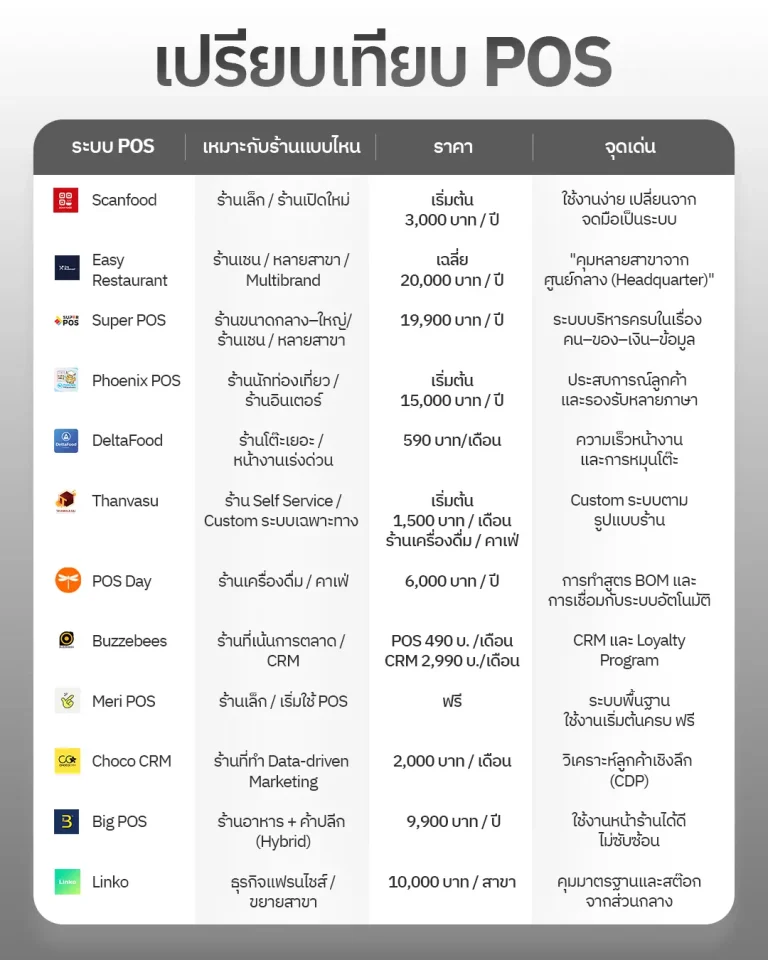 พาไปดูจุดเด่นของ POS ร้านอาหารแต่ละเจ้าแบบละเอียด แนวคิดของระบบ และความเหมาะสมกับประเภทร้านเพื่อช่วยให้คุณตัดสินใจได้ง่ายขึ้นว่า POS เจ้าไหนเหมาะกับร้านของคุณมากที่สุด